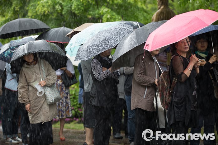(서울=포커스뉴스) 3일 오전 서울 서초구 국립외교원에서 열린 외교부 배우자회 어려운 이웃돕기 자선바자회에 시민들이 우산을 쓰고 기다리고 있다.