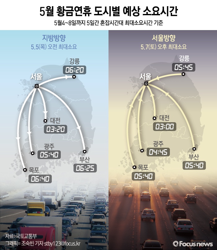 | △ [그래픽] 5월 황금연휴 도시별 예상 소요시간 |