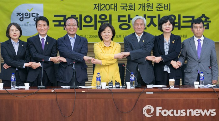 (서울=포커스뉴스) 심상정 정의당 상임대표와 김세균 공동대표가 3일 오후 서울 여의도 국회 의원회관에서 열린 20대 총선 당선자 워크숍에 참석해 당선인들과 손을 잡고 포즈를 취하고 있다. 왼쪽부터 추혜선, 윤소하 비례대표 당선인, 노회찬 당선인, 심 대표, 김 대표, 이정미, 김종대 비례대표 당선인.