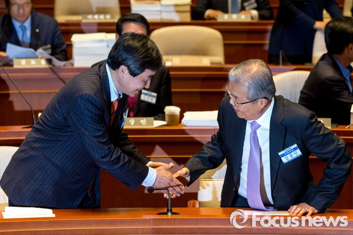 (서울=포커스뉴스) 김종인(오른쪽) 더불어민주당 비상대책위 대표와 이종걸 더불어민주당 원내대표가 3일 오후 서울 여의도 국회에서 열린 '20대 국회의원 당선자 및 당무위원 연석회의'에 참석해 악수 하고 있다.