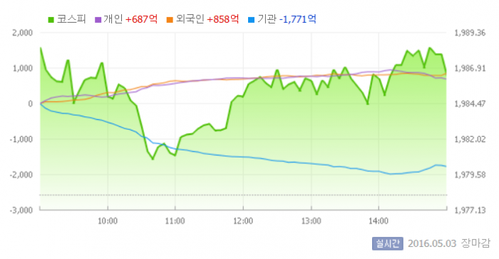 이날 코스피는 전일 대비 0.52% 상승한 1988.34로 장을 시작했다. 이후 지수는 개인과 외국인의 동반 사자에 힘입어 상승세를 이어갔다.