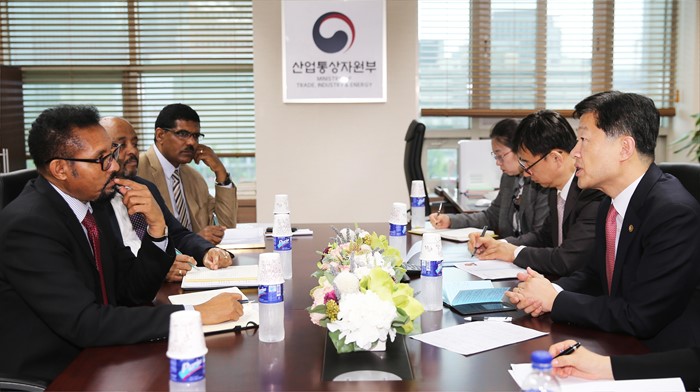 (서울=포커스뉴스) 우태희 산업통상자원부 2차관이 3일 오후 서울 종로구 정부서울청사 집무실에서 아케베 오쿠바이 메티쿠(ARKEBE Oqubay Metiku) 에티오피아 총리 특별보좌관(장관급)의 예방을 받고, 한-에티오피아 양국간 경제협력과 한국기업의 에티오피아 섬유공단 투자 등에 관해 의견을 교환하고 있다. <사진제공=산업통상자원부>
