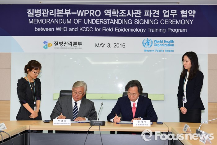 (청주=포커스뉴스) 정기석(오른쪽) 질병관리본부장이 3일 충북 청주 질병관리본부에서 신영수 세계보건기구(WHO) 서태평양지역 사무처(WPRO) 사무처장과 인적 교류 등을 위한 업무 협약을 하고 있다. <사젠제공=질병관리본부>