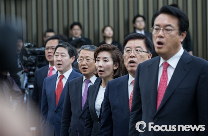 (서울=포커스뉴스) 3일 오후 서울 여의도 국회에서 열린 새누리당 원내대표, 정책위의장 선출 및 당선자 총회에서 후보자들이 애국가를 부르고 있다. 오른쪽부터 정진석 원내대표 후보자, 김광림 정책위의장 후보자, 나경원 원내대표 후보자, 김재경 정책위의장 후보자, 유기준 원내대표 후보자, 이명수 정책위의장 후보자.