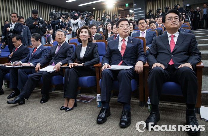 (서울=포커스뉴스) 정진석, 나경원, 유기준 원내대표 후보자 및 정책위의장 후보자들이 3일 오후 서울 여의도 국회에서 열린 새누리당 원내대표, 정책위의장 선출 및 당선자 총회에 참석하고 있다. 오른쪽부터 정진석 원내대표 후보자, 김광림 정책위의장 후보자, 나경원 원내대표 후보자, 김재경 정책위의장 후보자, 유기준 원내대표 후보자, 이명수 정책위의장 후보자.