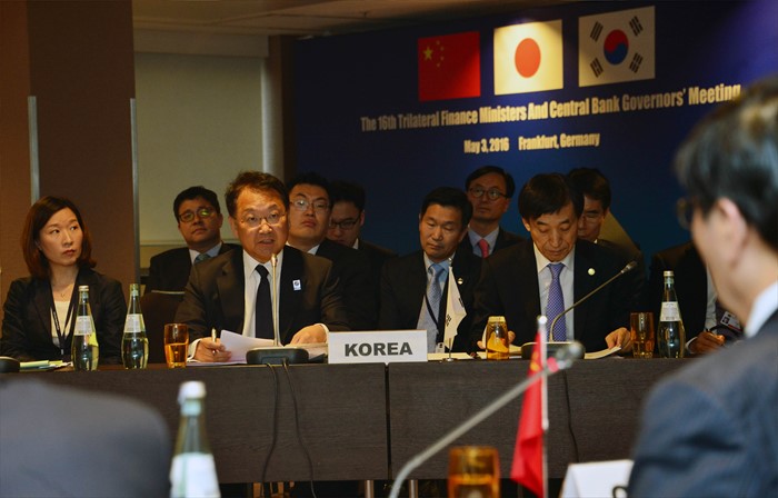 (서울=포커스뉴스) ADB연차 총회 참석차 독일 프랑크푸르트를 방문 중인 유일호 부총리 겸 기획재정부 장관이 3일(현지시간) 메리어트호텔에서 열린 제16차 한·중·일 재무장관회의에 참석해, 회의를 하고 있다. <사진제공=기획재정부>