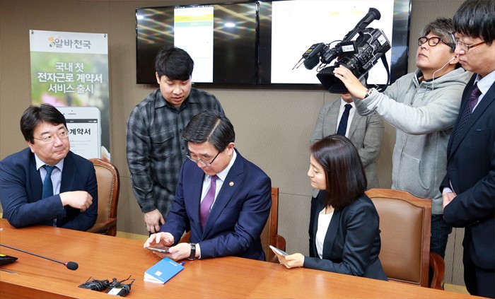 (t서울=포커스뉴스) 이기권 고용노동부 장관이 3일 오후 서울 중구 서울고용노동청에서 전자근로계약서를 선제적으로 도입하는 등 기초고용질서 준수에 적극적으로 노력한 최인녕 알바천국 대표에게 감사패를 수여하고 전자근로 계약서 작성시연을 하고 있다. <사진제공=고용노동부>