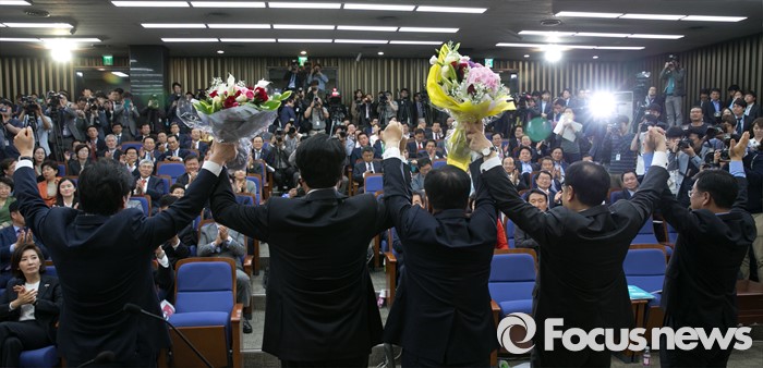 (서울=포커스뉴스) 3일 오후 서울 여의도 국회에서 열린 새누리당 20대 국회 첫 원내대표 및 정책위의장 선출을 위한 당선자 총회에서 선출된 정진석 신임 원내대표와 김광림 신임 정책위의장, 원유철 대표최고위원 권한대행, 김정훈 전 정책위의장 등이 손을 들어 포즈를 취하고 있다.