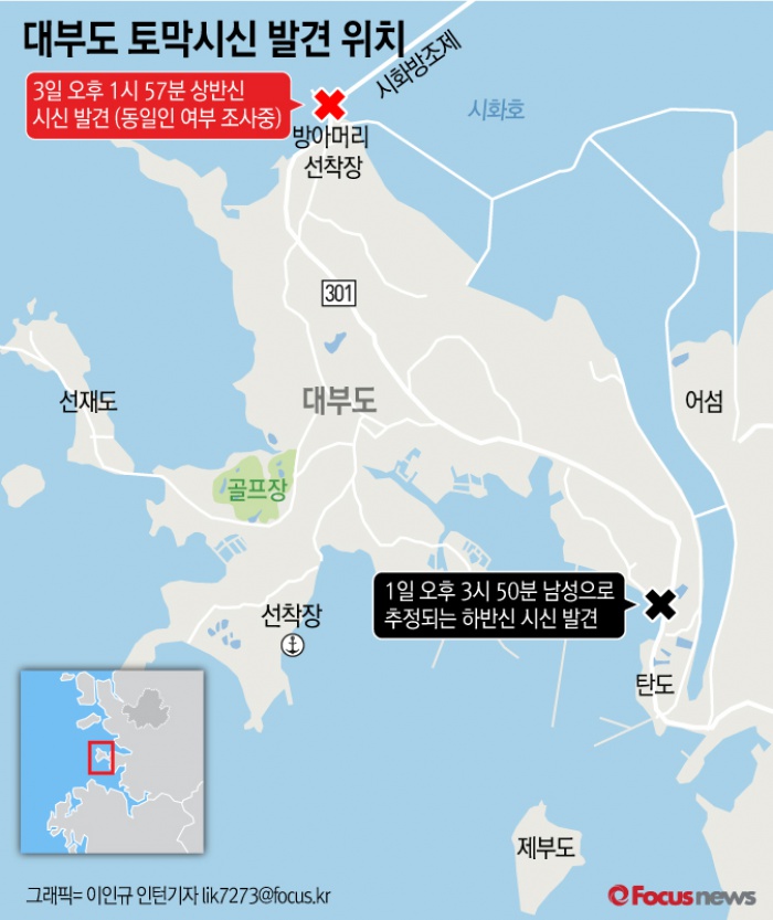 (서울=포커스뉴스) 경기 안산단원경찰서는 3일 오후 1시 57분께 경기 안산시 단원구 선감동 대부도 입구 방아머리 선착장 부근에서 상반신 사체를 발견, 지난 1일 대부도 방조제 인근 배수로에서 찾은 하반신 사체와 동일인인지 여부에 주목하고 있다.