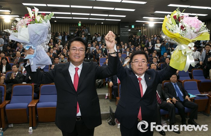 이날 여의도 국회에서 열린 '차기 원내대표 및 정책위의장 선출을 위한 당선자총회'에서 '정진석-김광림' 조합은 총 119표 중 69표를 얻어 결선 없이 원내대표-정책위의장에 당선됐다.3일 오후 서울 여의도 국회에서 열린 새누리당 20대 국회 첫 원내대표 및 정책위의장 선출을 위한 당선자 총회에서 선출된 정진석(왼쪽) 신임 원내대표와 김광림 신임 정책위의장이 취재진을 향해 포즈를 취하고 있다. 2016.05.03 박동욱 기자