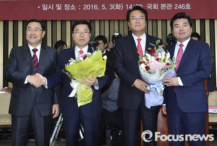 (서울=포커스뉴스) 3일 오후 서울 여의도 국회에서 열린 새누리당 20대 국회 첫 원내대표 및 정책위의장 선출을 위한 당선자 총회에서 선출된 정진석 신임 원내대표와 김광림 신임 정책위의장이 현 지도부로부터 축하의 꽃다발을 전달받은 뒤 포즈를 취하고 있다. 오른쪽부터 원유철 대표최고위원 권한대행, 정 신임 원내대표, 김 신임 정책위의장, 김정훈 전 정책위의장.
