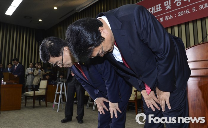 (서울=포커스뉴스) 3일 오후 서울 여의도 국회에서 열린 새누리당 20대 국회 첫 원내대표 및 정책위의장 선출을 위한 당선자 총회에서 선출된 정진석(오른쪽) 신임 원내대표와 김광림 신임 정책위의장이 감사 인사를 하고 있다.