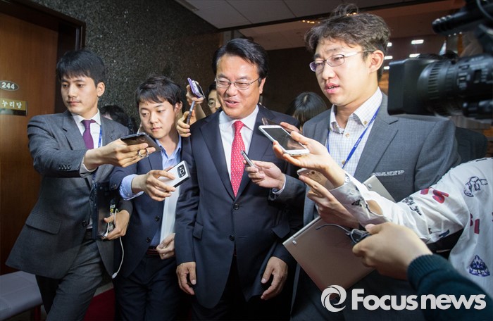 (서울=포커스뉴스) 3일 오후 서울 여의도 국회에서 열린 새누리당 20대 국회 첫 원내대표 및 정책위의장 선출을 위한 당선자 총회에서 신임 원내대표로 선출 된 정진석 후보가 기자들의 질문을 받으며 회의장을 빠져 나오고 있다.