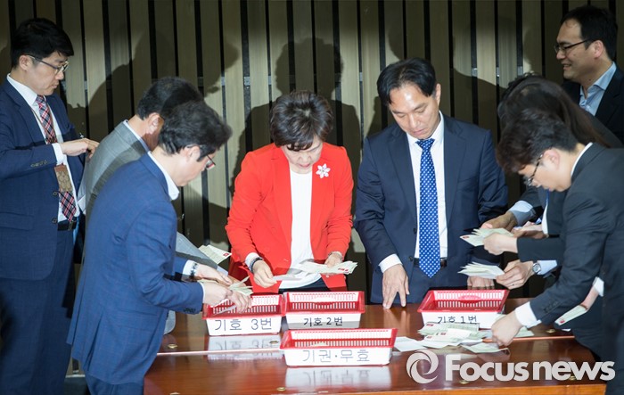 (서울=포커스뉴스) 3일 오후 서울 여의도 국회에서 열린 새누리당 20대 국회 첫 원내대표 및 정책위의장 선출을 위한 당선자 총회에서 당직자들이 투표함을 열고 결과를 확인하고 있다.