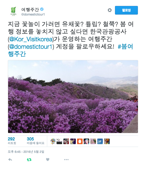 트위터코리아는 문화체육관광부와 함께 5월 한 달 동안 각종 문화, 관광 혜택과 관련 정보들을 집중 소개하는 특별 계정을 운영한다고 4일 밝혔다. 봄 여행 주간을 맞이해 5월 14일까지 한국관광공사의 여행주간(@domestictour1) 계정을 통해 실시간 봄 여행 정보를 제공할 계획이다.