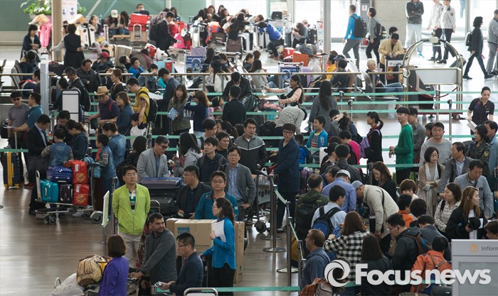 (인천공항=포커스뉴스) 4일 오전 인천국제공항 출국장에 황금연휴를 앞두고 출국하는 여행객들로 북적이고 있다.