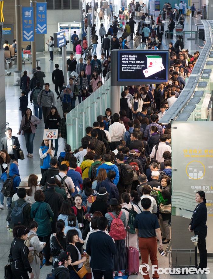 (인천공항=포커스뉴스) 4일 오전 인천국제공항 출국장에 황금연휴를 앞두고 출국하는 여행객들로 북적이고 있다.