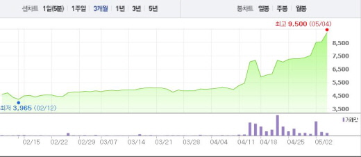 보성파워텍은 4일 오전 9시18분 현재 전일 대비 9.09%(780원) 상승한 9360원에 거래되고 있다. 이는 4월초 주가(4975원)와 비교했을 때 1.88배 상승한 수치다.