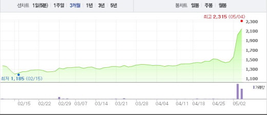 대호에이엘은 4일 오전 9시28분 현재 전날보다 6.42%(130원) 오른 2155원에 거래중이다. 대호에이엘은 전 거래일에도 가격제한폭인 29.81%의 상승폭을 기록했다.