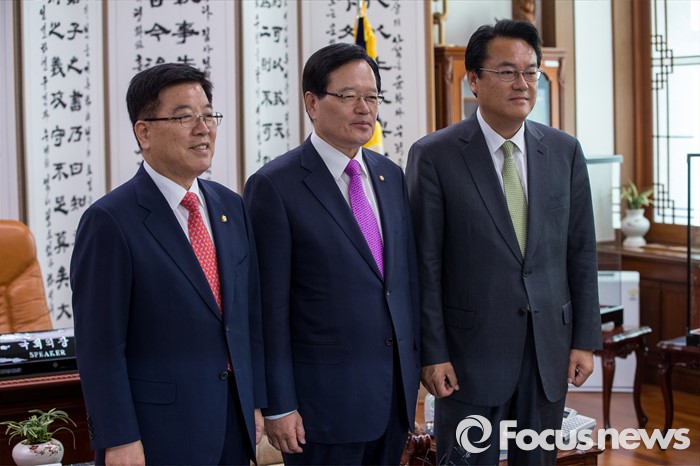 (서울=포커스뉴스) 정의화(가운데) 국회의장이 4일 오전 서울 여의도 국회에서 정진석(오른쪽) 새누리당 신임 원내대표와 김광림 새누리당 신임 정책위원장과 면담에 앞서 사진촬영을 하고 있다.