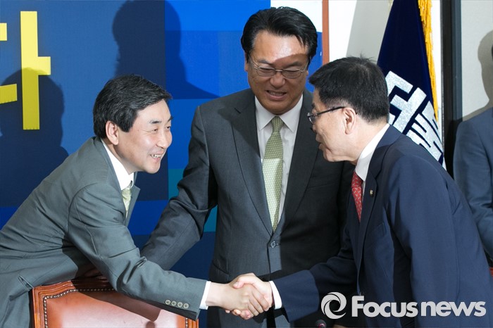 (서울=포커스뉴스) 정진석(가운데) 새누리당 신임 원내대표와 김광림(오른쪽) 신임 정책위의장이 4일 오전 서울 여의도 국회에서 이종걸 더불어민주당 원내대표와 악수하고 있다.