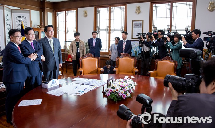 (서울=포커스뉴스) 정의화(가운데) 국회의장이 4일 오전 서울 여의도 국회에서 정진석(오른쪽) 새누리당 신임 원내대표와 김광림 새누리당 신임 정책위원장과 면담에 앞서 악수 하고 있다.