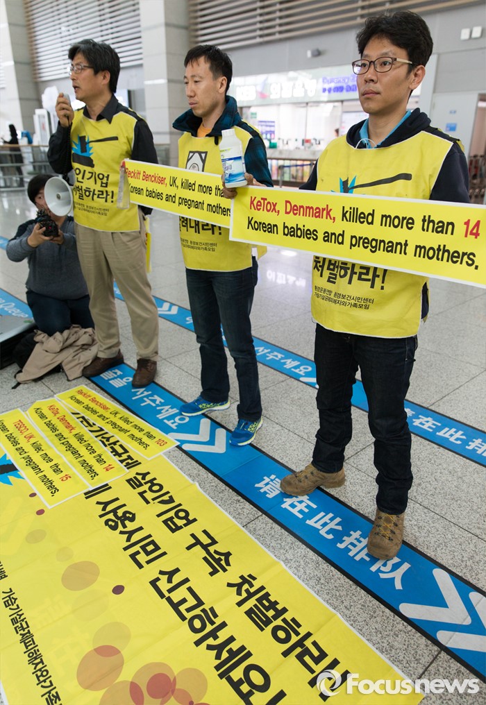 (인천공항=포커스뉴스) 4일 오전 인천국제공항 출국장에서 가습기 살균제 피해자 가족 모임과 환경보건시민센터 관계자들이 옥시레킷벤키저 영국 본사에 항의하기 위해 출국하기 전 기자회견을 하고 있다. 이들은 영국 런던에서 열리는 옥시레킷벤키저의 연례주주총회를 방문할 예정이다.