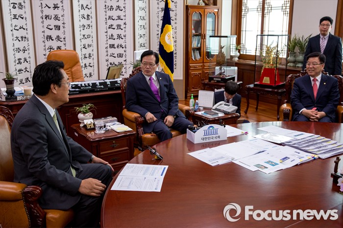 (서울=포커스뉴스) 정의화(가운데) 국회의장이 4일 오전 서울 여의도 국회에서 정진석(왼쪽) 새누리당 신임 원내대표와 면담 하고 있다.