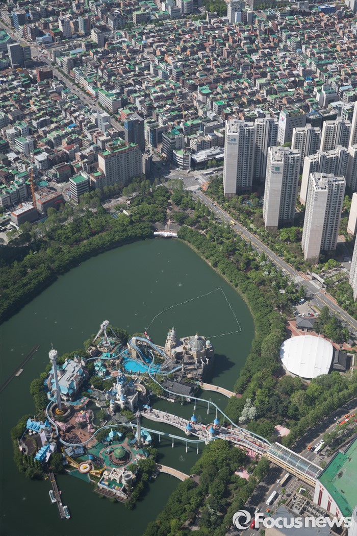 (서울=포커스뉴스) 여름이 시작됨을 알리는 입하(立夏) 절기를 하루 앞둔 4일 오전 서울 송파구 롯데타워에서 바라본 매직아일랜드와 석촌호수의 모습.