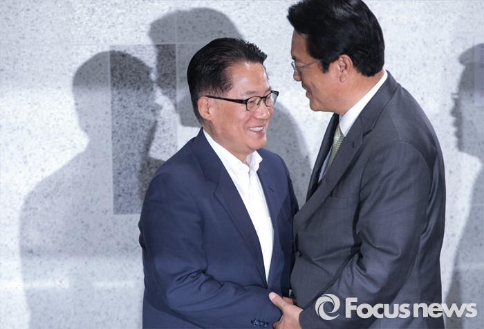 | △ 반갑게 인사하는 정진석-박지원 |
