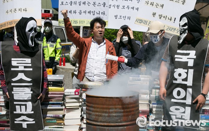 (서울=포커스뉴스) 사법시험 존치를 위한 고시생모임 회원들이 4일 오전 서울 여의도 더불어민주당사 앞에서 사시존치 법안을 19대 국회 임기내에 본회의에 상정할 것을 주장하며, 연막탄을 피운채 분서갱유 퍼포먼스를 하고 있다.