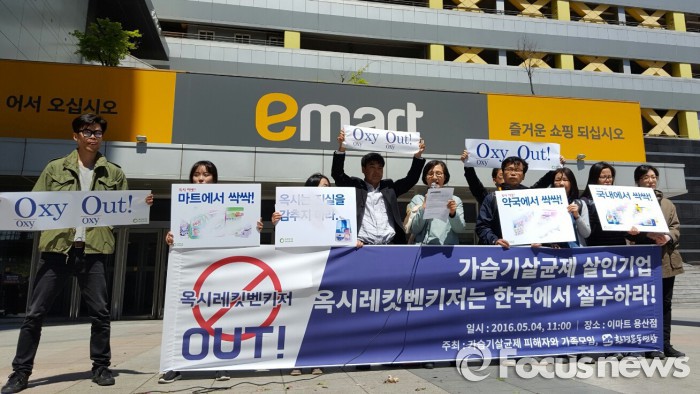 한편 홈플러스는 지난주부터 옥시 제품에 대한 판촉행사를 중단했고, 롯데마트도 옥시 제품의 재고가 소진되면 판촉행사와 신규 발주를 중단하겠다고 밝혔다.가피모와 환경운동연합이 4일 오전 서울 용산구 이마트 앞에서 기자회견을 열어 이마트에 '옥시' 제품 판매 중단을 촉구했다. 2016.05.04 정상훈 기자 가피모와 환경운동연합이 서울 용산구 이마트 매장 내 옥시제품 진열장에서 옥시 제품 불매 퍼포먼스를 하고 있다. 2016.05.04 정상훈 기자