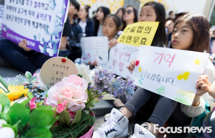 (서울=포커스뉴스) 4일 오후 서울 종로구 옛 일본대사관 앞에서 제1229차 일본군 위안부 문제해결을 위한 정기 수요집회가 열리고 있다.