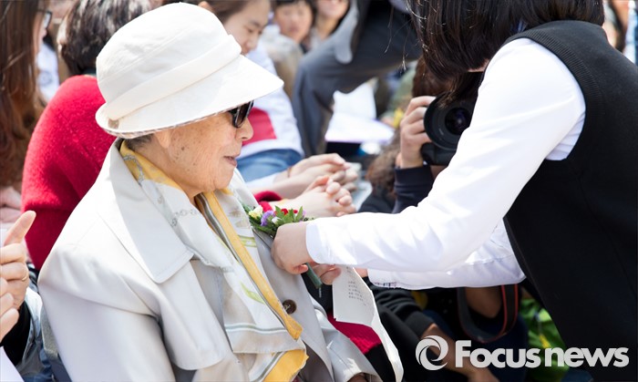 (서울=포커스뉴스) 4일 오후 서울 종로구 옛 일본대사관 앞에서 제1229차 일본군 위안부 문제해결을 위한 정기 수요집회에 참가한 한 학생이 김복동 할머니에게 카네이션을 달아드리고 있다.