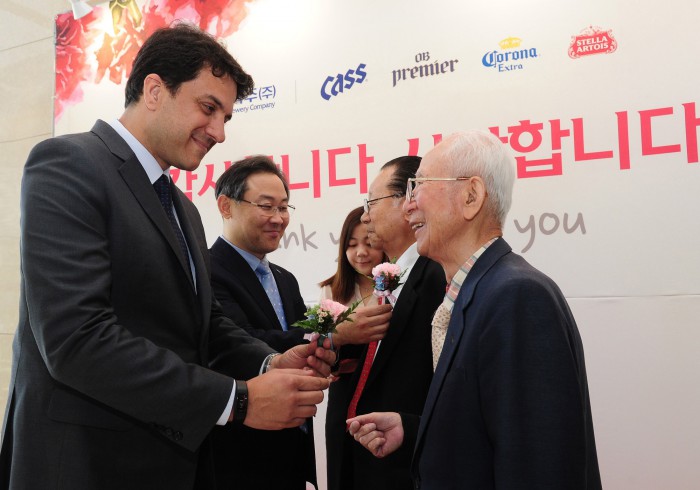 오비맥주의 '어버이날 행사'는 올해로 7회째다. 이날 행사에서 김도훈 대표를 비롯 오비맥주 주요 임직원들은 주류 유통사 원로 대표들에게 카네이션을 달아드리고 큰절을 올렸다.