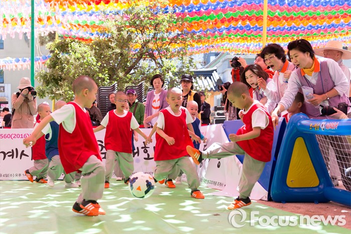 (서울=포커스뉴스) 4일 오후 서울 종로구 조계사 대웅전 앞에서 조계사와 홍법사 동자스님들이 축구대회에 참가해 실력을 겨루고 있다.