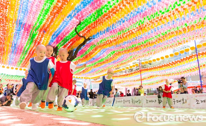 (서울=포커스뉴스) 4일 오후 서울 종로구 조계사 대웅전 앞에서 조계사와 홍법사 동자스님들이 축구대회에 참가해 실력을 겨루고 있다.