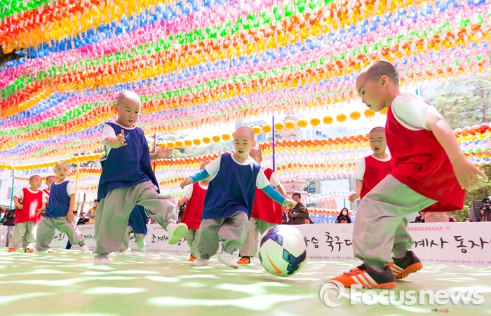 (서울=포커스뉴스) 4일 오후 서울 종로구 조계사 대웅전 앞에서 조계사와 홍법사 동자스님들이 축구대회에 참가해 실력을 겨루고 있다.