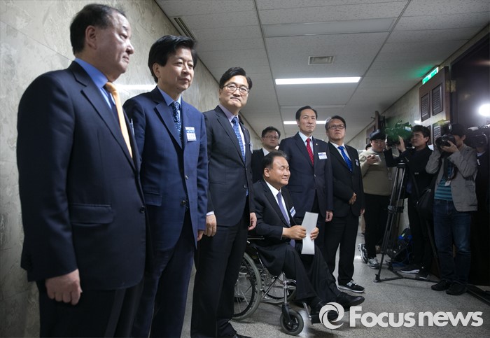 (서울=포커스뉴스) 4일 오후 서울 여의도 국회에서 열린 더불어민주당 20대 국회 1기 원내대표 선출을 위한 당선자 총회에 참석한 원내대표 후보들이 입장하는 의원 및 당선인들에게 지지를 호소하고 있다. 왼쪽부터 강창일, 노웅래, 우원식, 이상민, 우상호, 민병두 후보.