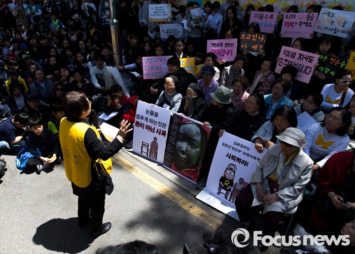 또 "이와 같은 전쟁범죄가 재발하지 않기 위해 근본적으로 전쟁없는 나라가 돼야 한다"고 덧붙였다.(서울=포커스뉴스) 4일 오후 서울 종로구 옛 일본대사관 앞에서 제1229차 일본군 위안부 문제해결을 위한 정기 수요집회가 열리고 있다. 2016.05.04 김인철 기자