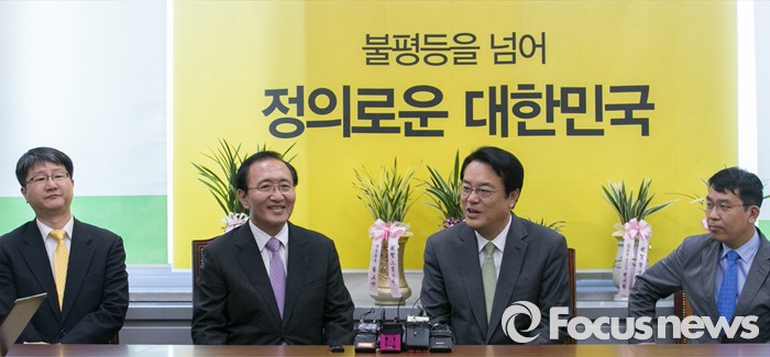 (서울=포커스뉴스) 정진석 새누리당 신임 원내대표가 4일 오후 서울 여의도 국회에서 노회찬 정의당 원내대표를 예방, 면담을 하고 있다. 왼쪽부터 김용신 정의당 정책위의장, 노회찬 원내대표, 정진석 새누리당 신임 원내대표, 김종대 정의당 비례대표 당선인.