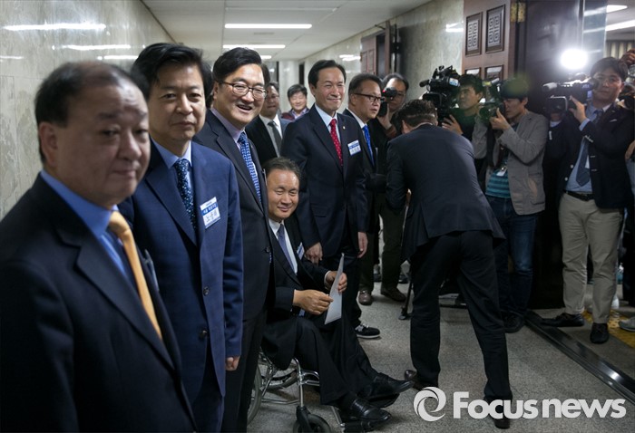 | △ 참석자들 기다리는 더민주 원내대표 후보들 |