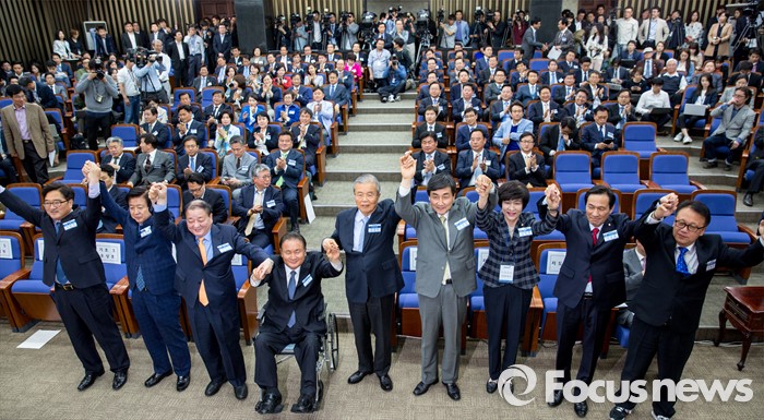 과반을 획득한 후보가 없기에 우원식우상호 후보간의 결선투표가 곧바로 진행된다.4일 오후 서울 여의도 국회에서 열린 더불어민주당 원내대표 선거에서 원내 지도부와 선거관리위원장을 비롯한 후보들이 손을 맞잡고 사진촬영을 하고 있다. 왼쪽부터 우원식 후보, 노웅래 후보, 강창일 후보, 이상민 후보, 김종인 비상대책위 대표, 이종걸 원내대표, 김영주 선거관리위원장, 우상호 후보, 민병두 후보. 2016.05.04 강진형 기자