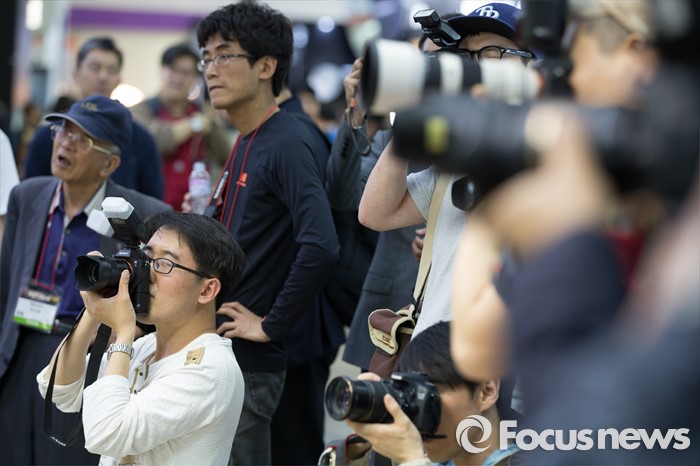 (서울=포커스뉴스) 4일 오후 서울 강남구 코엑스 A,B홀에서 열린 2016 서울국제사진영상기자재전(P&I)에서 관람객들이 모델을 촬영하고 있다.