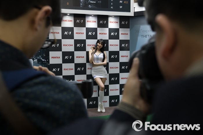 (서울=포커스뉴스) 4일 오후 서울 강남구 코엑스 A,B홀에서 열린 2016 서울국제사진영상기자재전(P&I)에서 관람객들이 모델을 촬영하고 있다.