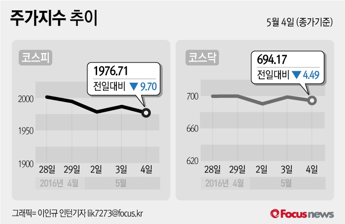 (서울=포커스뉴스) 4일 코스피지수는 전날 보다 0.49%(9.70포인트) 내린 1976.71에 장을 마쳤다. 코스닥지수는 전일 대비 0.64%(4.49포인트) 내린 694.17에 마감했다.