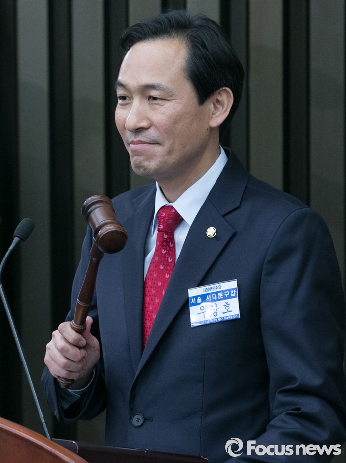 (서울=포커스뉴스) 4일 오후 서울 여의도 국회에서 열린 더불어민주당 20대 국회 1기 원내대표 선출을 위한 당선자 총회에서 선출된 우상호 신임 원내대표가 총회 산회를 선포하고 있다.