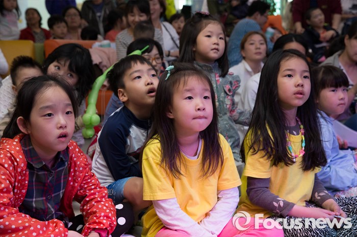 (서울=포커스뉴스) 어린이날을 앞둔 4일 오후 서울 서초구 서울시어린이병원에서 열린 '로봇댄스 및 체험' 행사에 참가한 어린이들이 공연을 관람하고 있다.