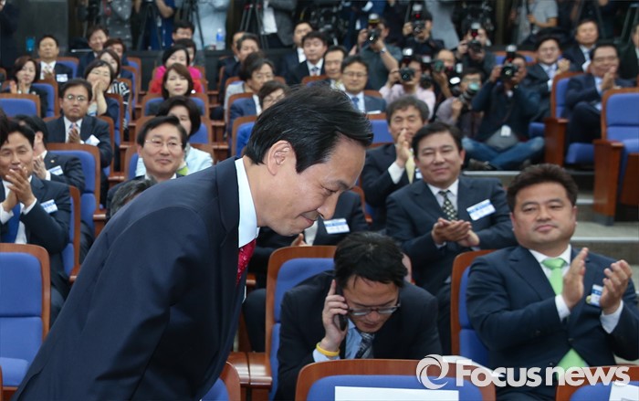 (서울=포커스뉴스) 4일 오후 서울 여의도 국회에서 더불어민주당 20대 국회 1기 원내대표 선출을 위한 당선자 총회에서 선출된 우상호 신임 원내대표가 인사하고 있다.