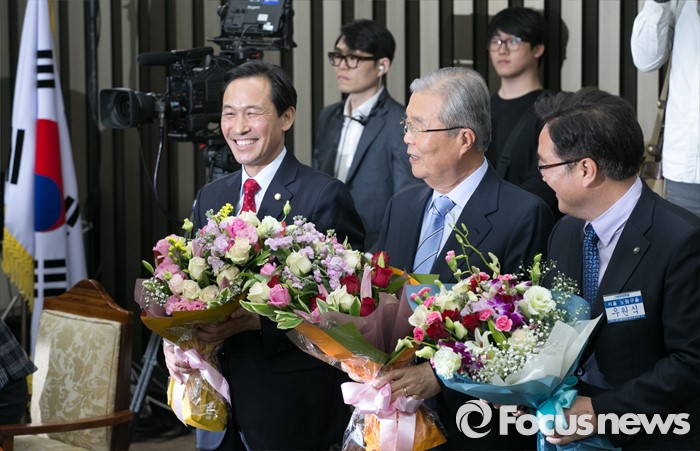(서울=포커스뉴스) 4일 오후 서울 여의도 국회에서 열린 더불어민주당 20대 국회 1기 원내대표 선출을 위한 당선자 총회에 참석한 김종인(가운데) 비대위 대표, 우상호(왼쪽) 신임 원내대표, 경쟁 후보였던 우원식 의원이 축하의 꽃다발을 들고 포즈를 취하고 있다.